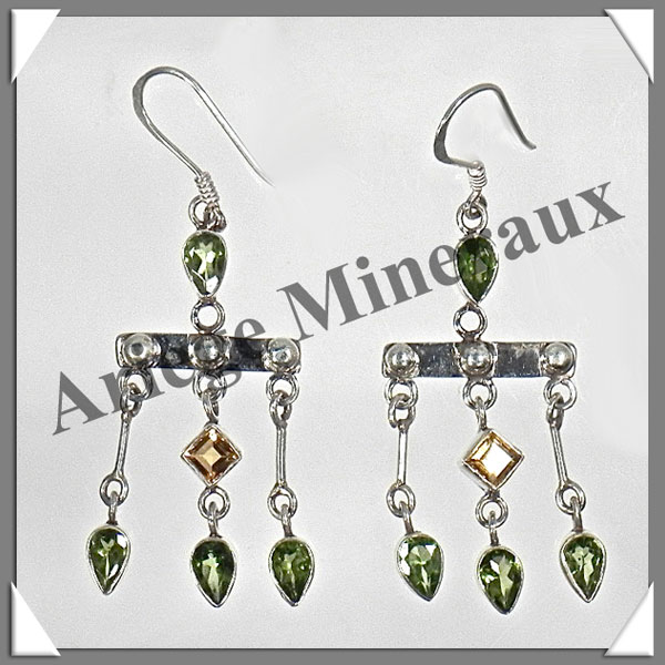 PERIDOT et CITRINE - Boucles d'Oreilles Argent - 5 Cabochons Facetés (3 Etages) - Hameçon - 50 mm - P022